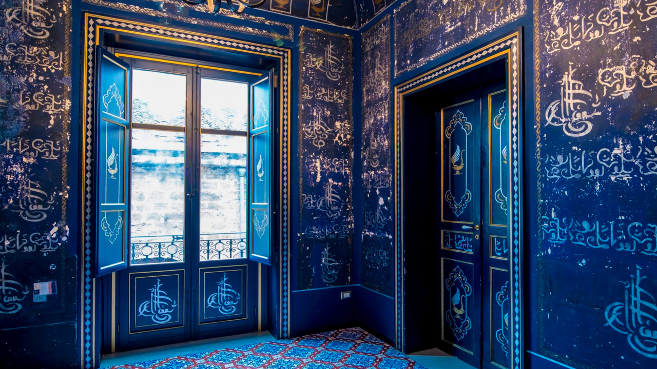 Colpo di scena. La stanza è un cubo, tutto spalmato di un blu uniforme e vellutato, al tempo stesso cupo, arcano e sfavillante. Ogni parete è decorata per intero da scritte in arabo, color oro e argento, ordinatamente disposte e disegnate con una grazia che delizia lo sguardo. Le iscrizioni più importanti sono formate da morbide e volteggianti pennellate, che s’intersecano in una sorta di danza, fino a formare dei “tughra”, cioè sigilli di epoca ottomana, con funzioni apotropaiche, cioè di talismano. Su ogni volta sono dipinte sette lucerne. Simboleggiano il momento della creazione dell’universo da parte di Allah. La frase che si ripete – per incidersi nella mente – lungo le pareti pare corrispondere a un hadith, un detto del profeta Maometto: “Sia lodato Dio, niente è simile a lui”. Così dicono alcuni studiosi, che si sono presi la briga di decifrare le iscrizioni. Anche le porte, dopo essere state sottoposte a TAC da un radiologo, vengono restaurate. Si scopre che sono anch’esse di colore blu e fittamente decorate. Un blu così pimpante e longevo è dovuto all’impiego della pittura a olio. All’inizio si pensa che la stanza sia una moschea.